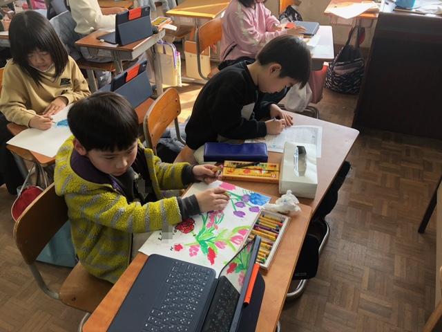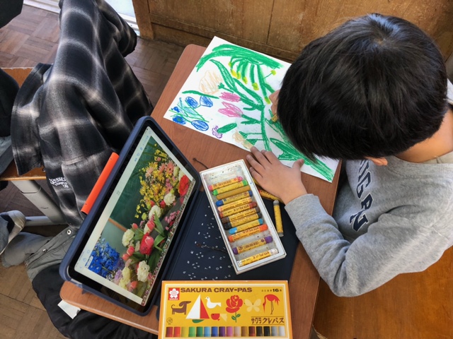 今日は2年生が特活や図工の時間に「夢一輪運動」の活動に取り組みました。「夢一輪運動」とは、NPO法人夢一輪の会のみなさんが、花を身近に触れる機会が少なくなった子どもたちに、花に触れる機会をつくることで、花の色や香りを感じ、花を通して癒しや安らぎ、感動の心を育む土壌をつくることを目的として県内の小学校で行われている活動です。2年生の児童たちは、図工室にきれいに飾られた花の美しさや香りに触れ、大喜びの様子でした。活動では、飾られている花の中から自分の一番好きな花を選び、その花の名前や色、形、匂いなどを学習し、最後に花の絵を描きました。子どもたちにとって貴重な体験ができた1日となりました。本日2年生が鑑賞した花は、全校の児童や来校者の方にも鑑賞していただけるよう、明日以降、改めて校内(児童昇降口等)に飾られます。