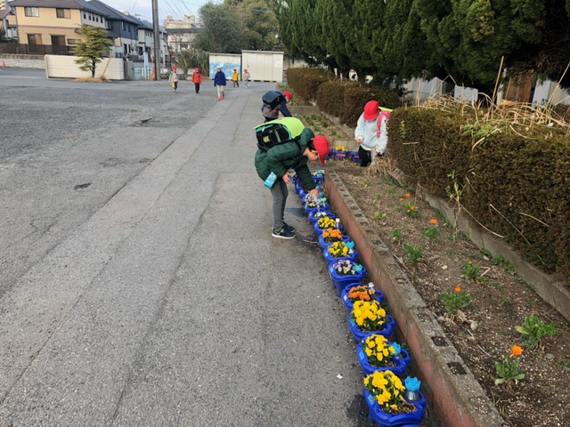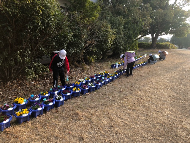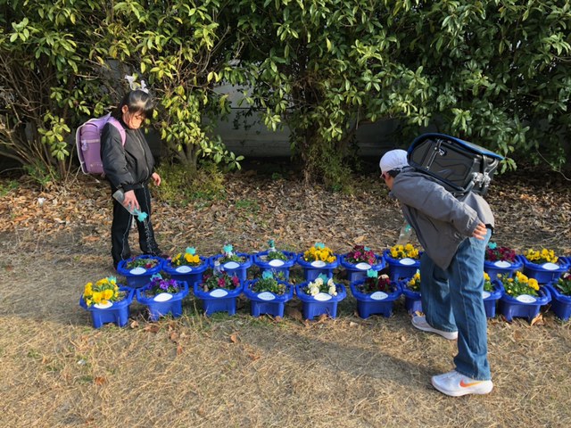 朝の登校後、1・2年生がランドセルを背負ったまま、まず向かうのはお花の水やり。1年生がビオラ、2年生がパンジーを大切に育てています。児童たちは花に「おはよう」と声をかけながら水やりを行っているとのことです。1・2年生が大切に育てたビオラとパンジーは、6年生への感謝の気持ちも込めて卒業式の会場の花道に飾られます。