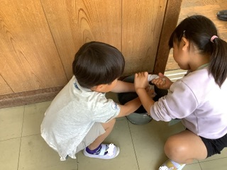 今日の1年生の教室の様子です。ちょうど国語の書写と特活で掃除の練習、そして給食の準備に向かう時間でした。書写では、担任の先生の言うことをしっかり聞いて「とめ、はね、はらい」に気を付けて文字を書いていました。また、そうじも今日からスタートするそうです。「お掃除をしたことある人?」と担任の先生がたずねると、「幼稚園でした事ある!」「保育園でした事ある!」「ぼくは、机をふく係だった!」と嬉しそうに話していました。ぞうきんを絞る姿も慣れたものです。保育園や幼稚園での経験がしっかり活かされています。「雑巾が黒く汚れたら、たくさん拭いたっていう事だから『お掃除名人』だよ。みんな『名人』ってわかる?」と担任の先生がたずねると、「わかるよ。『けん玉名人』とか・・・」すると、別の児童が「わかる!寿司名人もある!」と大きくつぶやきました。教室がニッコリ笑顔になりました。