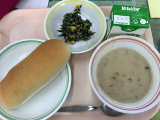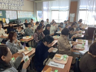 今日は、給食試食会でした。給食は良くも悪くも児童の学校生活に大きな影響を与えています。給食が嫌(給食を食べきれない、苦手なものがある・・・など)で学校に行きたくない、という児童もいますし、逆に「給食を食べたいから学校に行く」という児童もいます。少しでも食べてもらいたいという気持ちは担任だけでなく、栄養職員など給食提供に関わるすべての職員がそう思っています。本校の後藤栄養職員は、せめて学校では地産地消の食材を使ったり、旬のものを使ったりしながらおいしさにこだわって給食を作りたい!と日々頑張っています。切り方ひとつにも、おいしく感じられるように工夫しています。今日は、後藤栄養職員から食育講話があり、その後、給食準備の参観をして試食を行いました。今日の献立は、コッペパン、牛乳、里芋のシチュー、ひじきのサラダでした。大人になって食べるコッペパン、子どものころに食べたコッペパンと同じ味だったでしょうか。