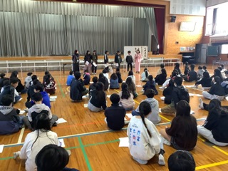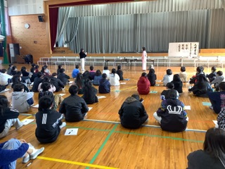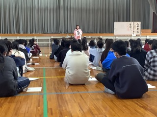 26日、生き方を考える「人権講演会」が行われました。講師は、徳島県で「人権書道家」として活躍されている阿部千明さんです。阿部さんの講演の中で、阿部さんは児童に「〇〇を漢字一文字で表すと?」とお題を出しました。私が心に残ったのは、「家族を漢字一文字で表すと?」のお題に対しての児童の答えでした。ある児童は「感」と書きました。理由は、「家族がうざい時もあるけれど、感謝しているから」と答え、またある児童は「一」と書き、その理由に、「家族は一番の存在だから」と答えました。同じお題でも、答えは様々で、同じ一文字を選んでいても、その文字への思いは人それぞれであることに気づき、子どもたちは「なるほど。みんなの考えがあって面白い。」と話していました。阿部さんも、子どもの感性のすばらしさを間近に感じ、笑顔があふれていました。人権学習は難しいこともあるけど、それでも、勉強し続けていくことは大切なんだと児童に伝えてくれました。