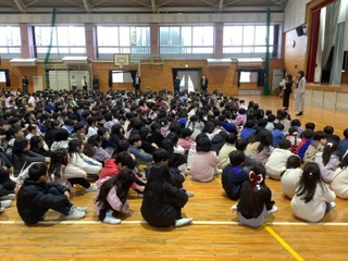 さて、今日の終業式では、1年生ひぐちさん、3年生なかじょうさん、5年生ゆきたけさんが児童を代表して2学期の振り返りを発表してくれました。1年生ひぐちさんは、運動会のダンスに頑張ったことや、冬休みは縄跳びに頑張りたいことを発表してくれました。3年生のなかじょうさんは、毛筆や音楽集会に頑張って取り組んだことを話し、3学期もいろいろなことに頑張りたいと発表してくれました。そして、5年生のゆきたけさんは、のつはる宿泊体験学習や運動会の係に頑張ったことを伝えてくれました。一方で給食を時間内に食べきれなかったことや算数の発表ができなかったことを3学期に頑張りたいとも話しました。さらに6年生がやってきたことを自分もやれるようにがんばりたい!と結びました。最後に6年生さかもとさんのピアノ伴奏で校歌を歌い、生活指導部の堀先生が冬休みのきまりについて確認をしました。