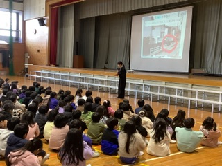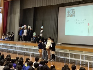 今日の全校集会は、給食委員会、栽培委員会、生活委員会からの発表やお知らせがありました。給食委員会はスライドを使ってバランスのよい食事についてわかりやすく発表しました。栽培委員会からは花壇やプランターに植えられている花の紹介や花を大切にしようと花などのキャラクターになりきり愉快に呼びかけられました。生活委員会からは今月の目あて「かえったら すぐにてあらい ていねいに」が紹介され、病気をしないための心がけについて話がありました。最後に、生徒指導担当部から歩道の通行の仕方について指導がありました。だんだん寒さが厳しくなりますが、病気やケガに気を付けて元気に登校してくれることを願っています。