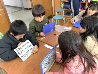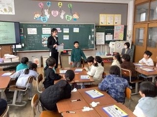 今日は1の4山崎教諭の初任研最後の授業でした。特別活動の学級活動で「学習発表会でどんなことを発表するか決めよう」が議題でした。今月27日は、学年末授業参観です。授業参観では学習発表会が予定されており、1年生になってできるようになったことや頑張ったことをおうちの方に発表しよう、何にしようかなと一人ひとりが考えました。また、授業のはじめに、昨年度の1年生(現2年生)の発表を見せ、より具体的にイメージさせました。「ぼくは、時計が読めるようになったから時計の発表にしようかな。」「私はなわとび!1年生になって跳べるようになったから。」「私は鍵盤ハーモニカで演奏しようかな。〇〇が吹けるようになったから。」とイメージは膨らみます。そして、友だちの話を「うんうん!」とうなづきながら耳を傾けています。この1年で大きく成長しました。おうちの方々、学習発表会を楽しみにしていてくださいね。