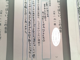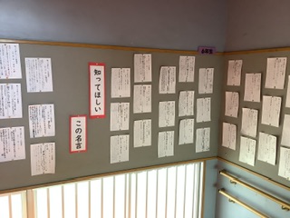 踊り場の掲示板には写真のような掲示がされています。6年生は国語の授業で扱ったのでしょうか、「知ってほしい、この名言」が貼られていました。それぞれが今の自分に一番響いた名言を選んでいるようでした。