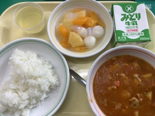 今日の給食は6年2組ゆりさん、けいとさん、こうせいさん、さくらのさんの立てた献立「ごはん、チキンカレー、フルーツポンチ、牛乳、ゆずゼリー」です。アピールポイントは、世代問わず好みそうという事や色が鮮やかで栄養があるということでした。今日の放送で、世代問わず好み・・・というところを伝えたかったのか「学校には、6歳の1年生から60歳近くの人までいます。・・・」とアナウンスされ、思わず苦笑しました。私は間違いなく、60歳近くの人に当たるのかもしれません、いや、当たります。まあ、それは良いとして、今日のゆずゼリー、調理員さんの手作りです。いつも伝えていますが、約1000個を手作りしてくれているんです。すごいと思いませんか。とっても優しい味のやわらかい、風味豊かなゆずゼリーでした。