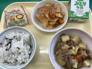 今日の給食は6年1組ももかさん、にこさん、そうたさん、はるとさんの立てた献立「わかめご飯、肉じゃが、野菜チップス、牛乳、豆乳入りプリンタルト」です。アピールポイントは「人気メニューであることや栄養バランス、さらにはビタミンが豊富でインフル予防につながるとのことです。確かに!いつだったか校長室に来た児童が「豆乳入りプリンタルトが大好き!」と話していたことがありました。きっとその児童はプリンタルトを給食の献立に取り入れてくれた6年生に感謝しているはずです。