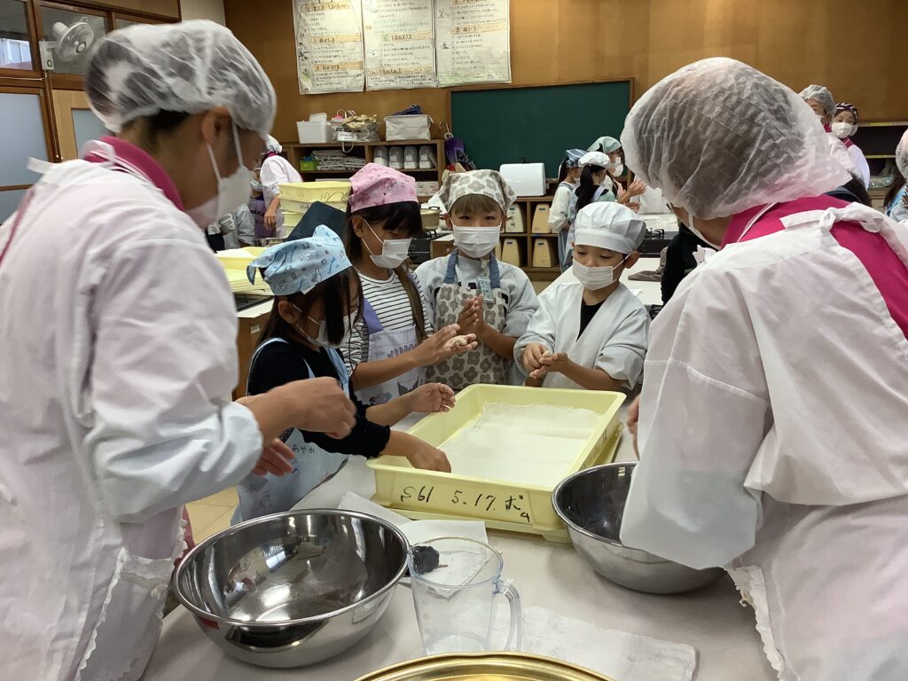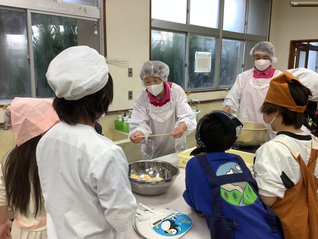 明治婦人会の方々に来ていただき、記事の捏ね方や伸ばし方など、丁寧に教えてもらっていました。子どもたちも真剣に話を聞きながら、集中して取り組んでいました。