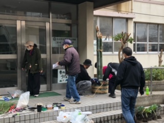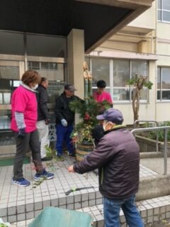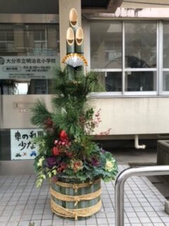 子どもたちに、門松を作って見せてあげたい、喜ぶ顔が見たいということを運営委員会の中でお願いすると、PTAの方がやりましょうと言ってくれ実現した門松づくりです。12月21日(日)9:00~PTA執行部と学校、そして地域の方にお手伝いをお願いして作ることになりました。あいにくの雨、そして風の強い寒い中始めた門松づくりですが、神社の門松を作っていた小池原の方が、私たちの手際の悪さを見かねて手伝ってくださいました。さすがプロです。きれいで立派な門松が3時間で出来上がりました。朝門松を見た子どもたちがすごいと言ってくれたと聞いてよかったなと思っています。お家の方も見に来てください。地域の方、神社で門松を作っていた方、PTAの方ありがとうございました。