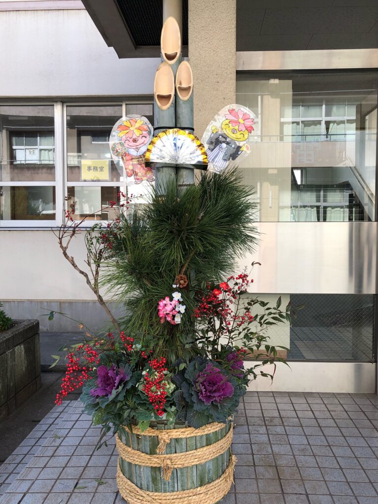 先日職員玄関前に設置した、門松ですが子どもたち大変喜んでいます。その門松に、今日コスミーとモスミーの明治北のキャラクターが飾られました。お家の方も見に来てください。1月の始業式前まで飾っておく予定です。