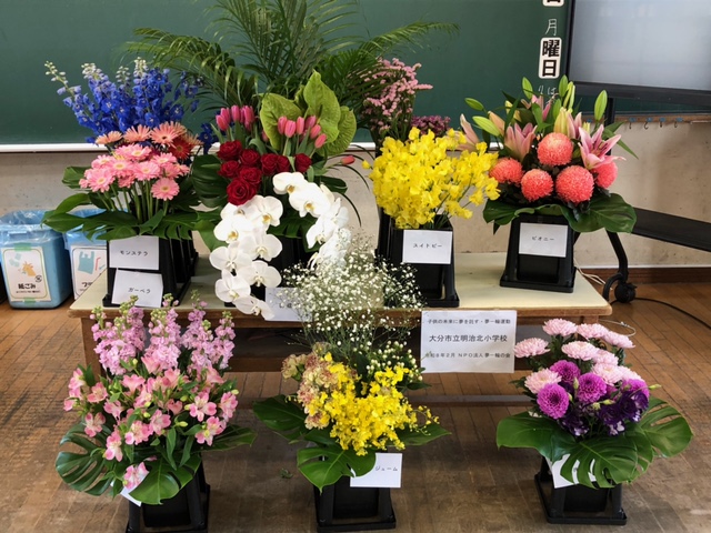 2年生の教室の中にお花がいっぱい咲いています。これは夢一輪運動で、子どもたちが、多くの花を見て触れ、観察することで、心豊かな心や感性を育む教育活動で、「夢一輪の会」の方が行ってくれています。
