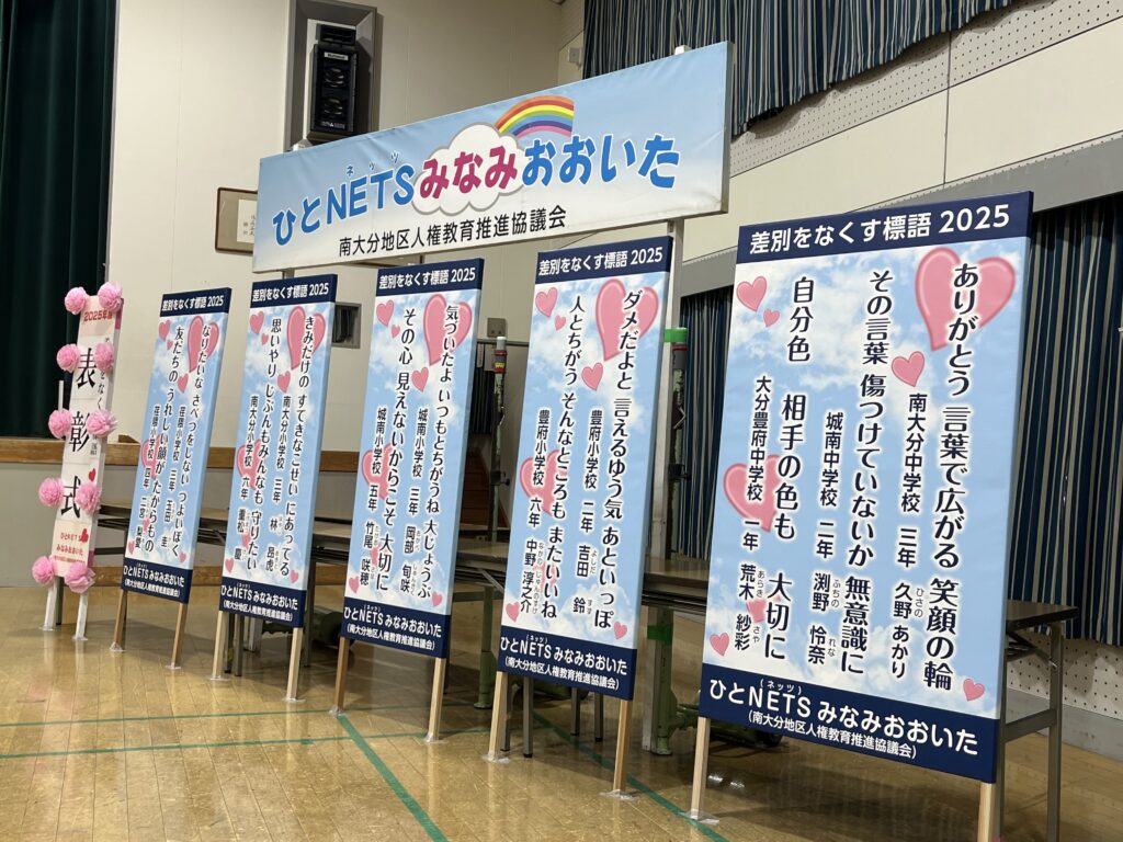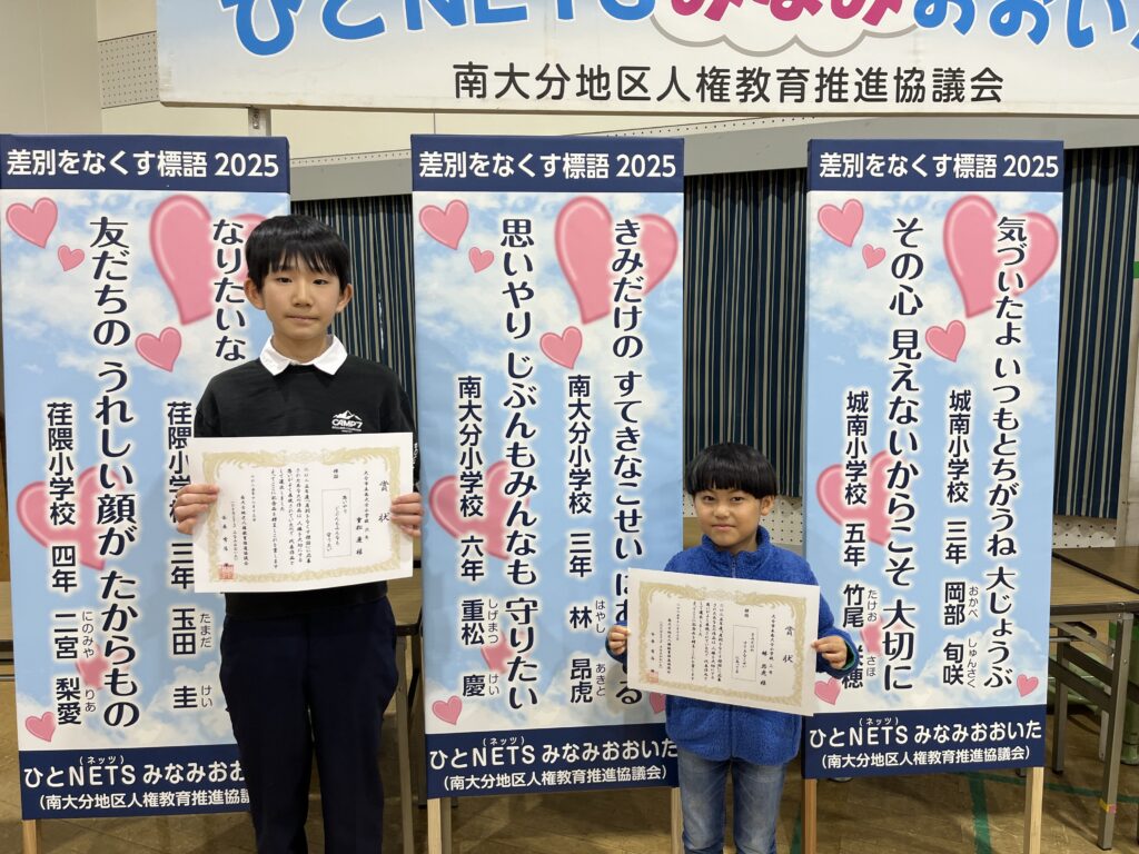 13日(土)、南大分公民館でひとNETSみなみおおいた主催の『差別をなくす標語』の表彰式がありました。南大分地区の7小中学校から作品が集められ、本校からは林昂虎さん(3年)と重松慶さん(6年)の2人の作品が表彰されました。