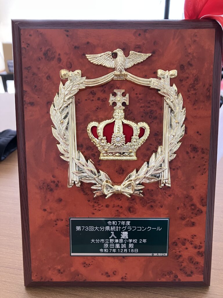 令和7年度大分県統計グラフコンクールに、野津原小学校から2件、応募しました。2年生が応募した「せかいのかぶとむしの数」が、入選しました。先日(12月8日)、県庁で表彰式があり、表彰状とともに立派な盾をもらったそうです。今日、わざわざ、校長室に見せに来てくれました。すごいですね。引き続き、かぶとむしのみならず、データやグラフなど、興味関心を広げていってほしいと思います。