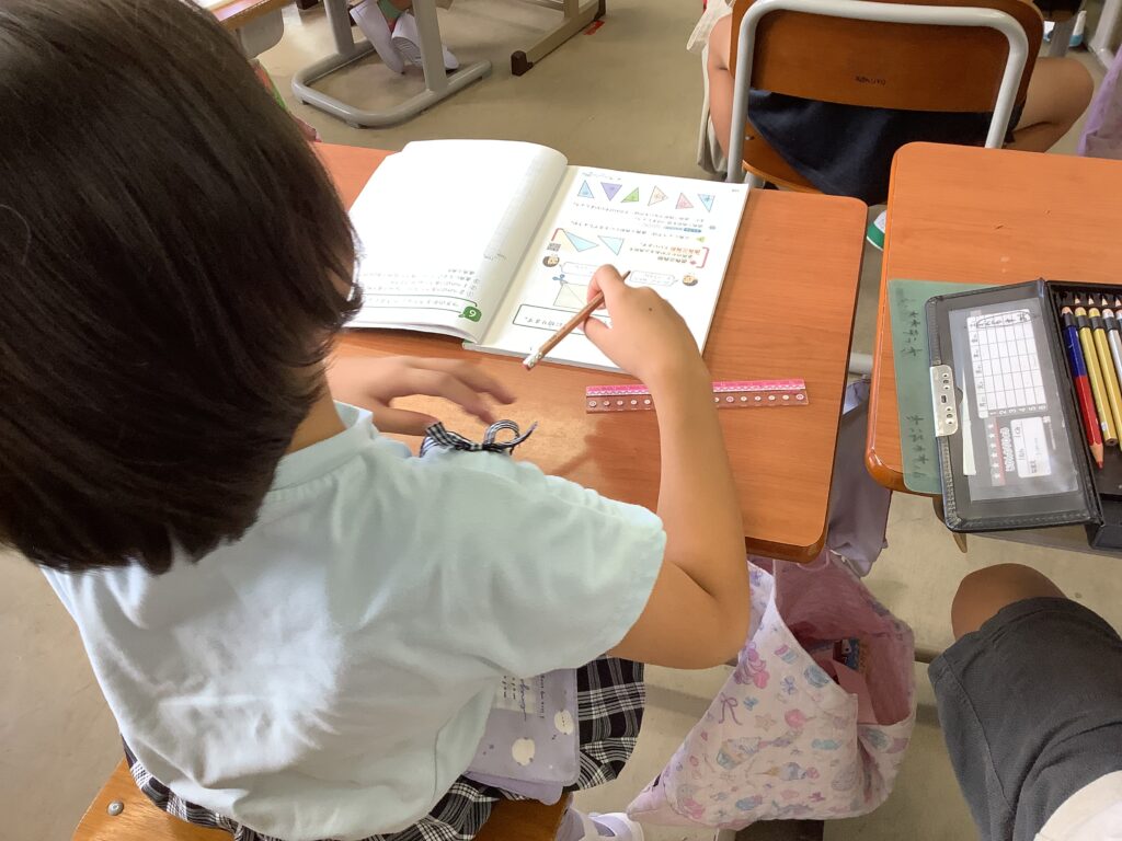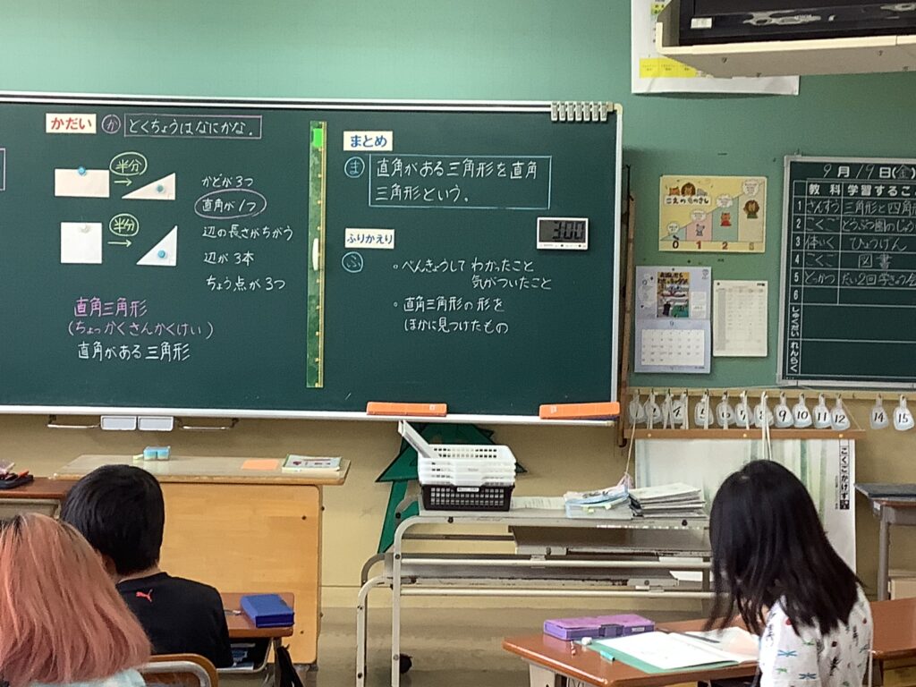 2年生は、『三角形と四角形』の続きの学びをしていました。長方形は、4つの角がすべて直角な四角形、長方形の中で4つの辺の長さがすべて同じものが正方形。長方形を対角線でまっすぐに切ると、二つの三角形ができます。その三角形のひとつの角は直角です。ひとつの角が直角な三角形を、直角三角形といいます。正方形を対角線でまっすぐに切ってできた三角形も、直角三角形。二年生でも使う定規の角は直角ですので、定規の角をあてれば、直角三角形かどうかがわかります。パン屋さんで売っているピザパン。これは、長方形のピザパンを対角線上に半分に切って売っています。ということは、このピザパンは直角三角形です。すぐに思いついた直角三角形がピザパンでした。他にあるでしょうか。頭が固くて、すぐに思いつきません。