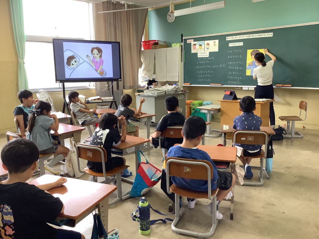 1年生は、栄養教諭の武田先生が来てくださり、食育について学んでいました。まず、「どうして、朝ごはんを食べて来なかったのかな?」について考えます。子どもたちから、「時間がない。」「おなかがすいていない。」「食欲がない。」などの考えがでました。次に、「朝ごはんを食べないと、どうなりますか?」について考えます。子どもたちから、「授業中におなかがすく。」「元気がでない。」「走れない。」「力が出ない。」「やる気が出ない。」などの考えがでました。子どもたちもよくわかっていますね。これから、いよいよ運動会練習が始まります。まだ、熱中症のリスクはありますので、十分な睡眠と朝ごはんで、少しでも熱中症のリスクを下げていただければと思います。朝は、ぎりぎりまで寝るのではなく、朝ごはんが食べられる時間に起きるように、それが難しいのであれば、もっと早く寝るようにしてほしいと思います。小学校ではじめての運動会、活躍してもらいたいので、朝ごはんを食べましょうね。