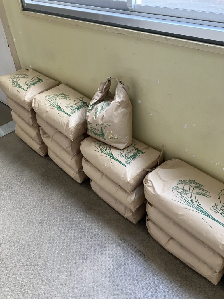 5年生が、6月11日に田植えをして、9月29日に稲刈りをして、収穫したお米が学校に届いていました。15kgの袋が15袋。15✕15=225kg。最後の袋は7kgと書いてあるので、225-8=217kg。調べてみました。1kgは、およそ6.7合。1合は、お茶碗2杯分くらい。217✕6.7✕2=2908。なんとお茶碗、2908杯の、ありがたい新米です。もっと計算します。1日3杯のごはんをいただく場合、969日分。2年と239日。田植えの苦労を知っている5年生は、今後、お米を粗末に扱わないと思います。
