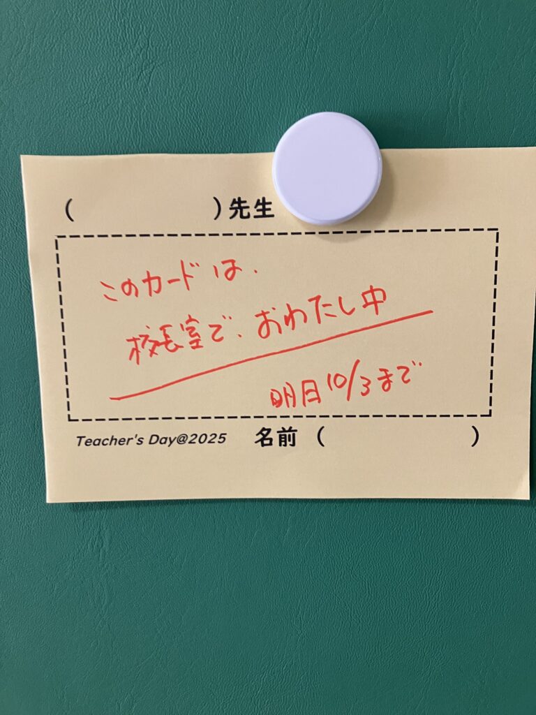 今日は、朝活動の時間に、全校集会がありました。月に1回、月初に開催されます。子どもたちに話した内容を紹介します。9月の生活のめあては、「すすんであいさつしよう」でした。自信を持ってめあてを達成できたと思う人に、手をあげてもらいました。挙手した子どもは、80%くらいでしょうか。朝の挨拶で相手意識を持ってきちんと挨拶ができていると感じるのは、自分の方から挨拶をする子ども、こちらを向いて笑顔を見せてくれる子ども、他の人にも挨拶をする子ども、挨拶とともに会釈をする子ども。表現方法は人それぞれですが、相手が気持ちよいと思ってくれる挨拶を想像して、それができるようになればよいですね。大きな声は出ていなくても、口が動いて挨拶をしてくれようとしている子どもにも相手意識を感じます。もう少しがんばれば、声が出ると思います。がんばれ。この話の中で、評価は最終的には他の人がするけれども、自分で自分のことを正しく評価すること、自己評価が大切という話をしました。できていないのにできたと評価したり、逆に、できているのにできていないと評価したりすることがないように、正しく自己評価できるようになってほしいという話をしました。もうひとつは、10月5日は何の日、という話です。日本では、あまり知られていないのですが、World Teacher’s Day、先生の日、つまり、先生に感謝する日です。子どもたちに、カードを準備しているので、先生に感謝の気持ちを伝えたい人は、カードをもらいに来てください、と話をしました。書く、書かないは自由です。主体的に取り組んでほしいと思います。集会の後、早速、カードをくださいという子どもが校長室に来てくれました。わかりました。カードをたくさん、準備しておきますね。