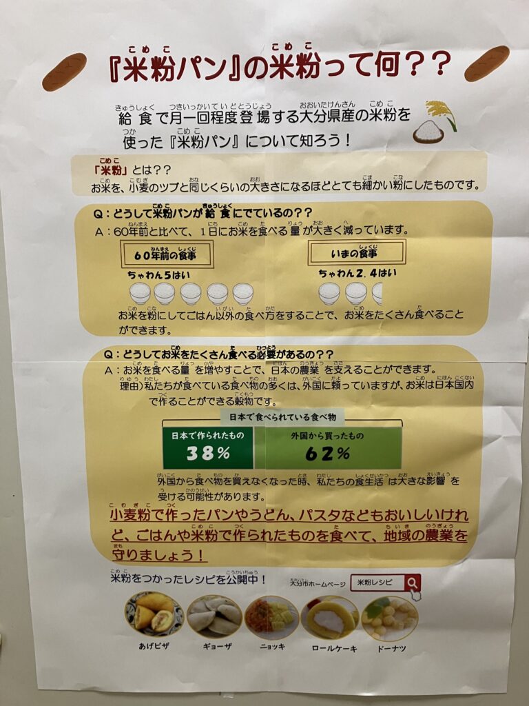 お米つながりで、米粉についてです。昨日、3年生の七瀬柿生産に関する授業に、市役所の方が来られており、米粉に関するポスターをお持ちいただきました。日本のお米、農業を支えましょうという趣旨です。給食室前に掲示させてもらいました。