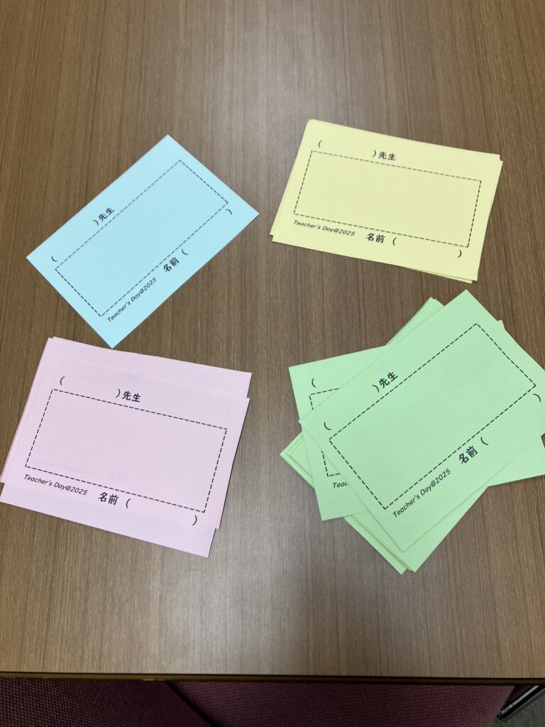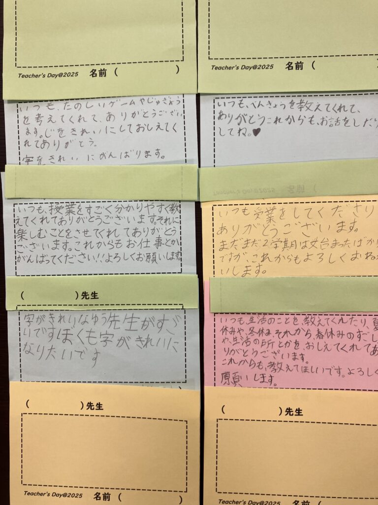 昨日(10月2日)の全校集会で呼びかけた、10月5日の先生の日に向けて、感謝の気持ちをカードに書こうキャンペーン。多くの子どもたちが、カードを取りに、校長室まで来てくれました。準備したカードは、4色。それぞれ、好きな色のカードに書いてもらいました。一部を紹介しましょう。「授業をわかりやすく教えてくれて」、「楽しむことをさせてくれて」など、先生にとって、うれしい言葉が並んでいます。とりまとめて、先生方にお渡ししようと思います。代表して私からも。先生方、児童第一義の学級運営をしていただき、ありがとうございます。引き続き、よろしくお願いします。Have a good weekend!
