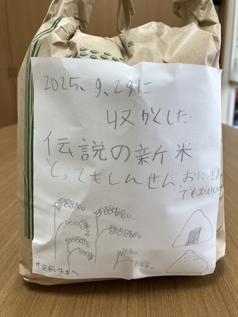 5年生が田植えをして9月29日に収穫したお米を、ポップ付きの米袋でいただきました。ありがとうございます。獲れたての新米です。先日、いただいた塩結びは絶品でした。しばらく、塩結びだけで生きていけそうです。が、たんぱく質、ビタミン、他の栄養とともに、おいしくいただきたいと思います。収穫した残りのお米をどうするかは、5年生が考えてくれるそうです。