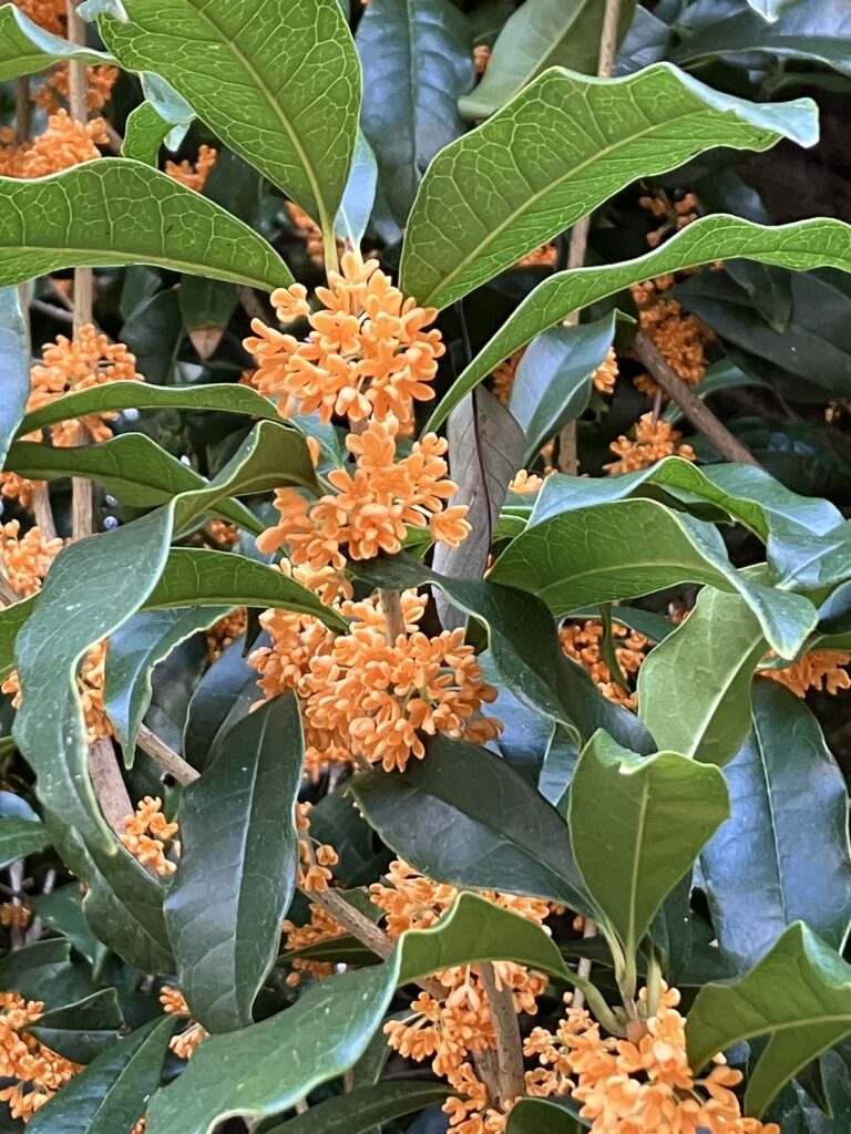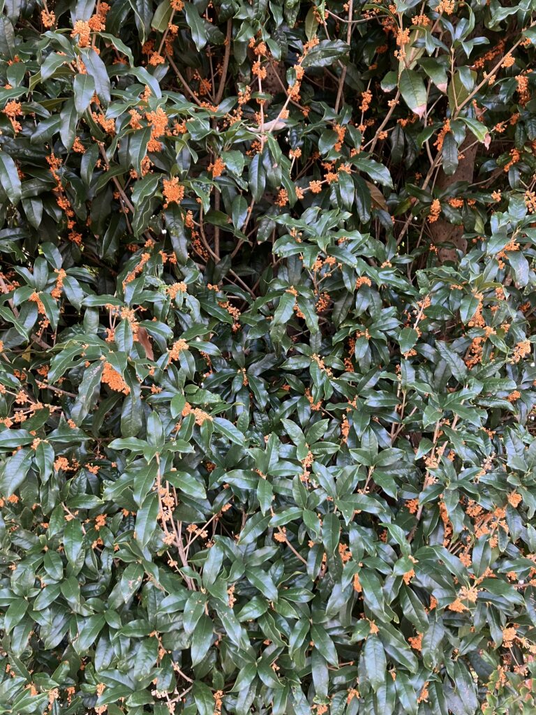 金木犀の花が咲きました。きれいなオレンジ色をしていることがわかります。金木犀のイメージは、これですね。3枚目の写真は、ちょうど一週間前の金木犀の写真です。まだ、緑色をしています。つまり、この一週間で花が咲き、香りが強くなってきたということになります。ここで、問題です。この金木犀の花、どれだけの期間、開花しているかご存知でしょうか。