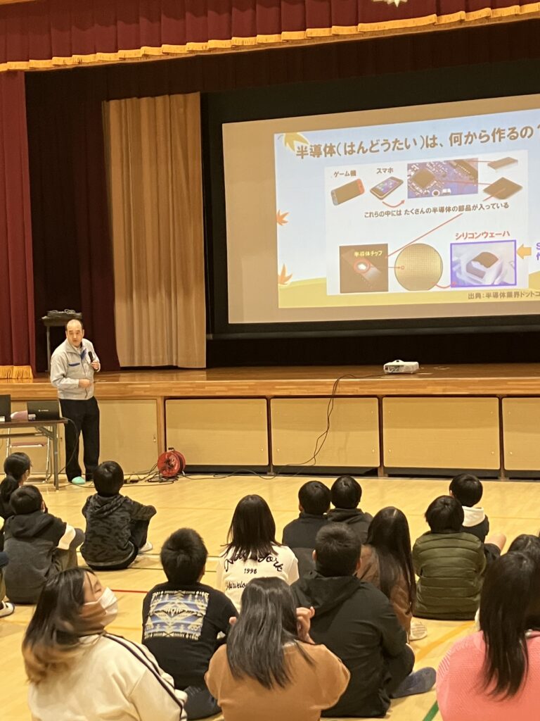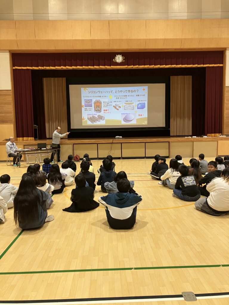 質問もたくさんしてくれました。シリコンウェーハは1枚いくらですか。およそ、1枚1万円。もっと高いものもあります。初任給の月給は、シリコンウェーハで20枚から30枚くらいだそうです。働いていて、一番うれしかったことは何ですか。例えば、今日のような授業は本当に楽しいです。興味を持って聞いてくれて、やりがいがあります。部下に注意をしたときに、後日、その意図がわかったとお礼を言ってもらえたときにうれしいと感じました。働いていて楽しいですか。働いていると、しんどいこと、たいへんなことと、うれしいこと、楽しいことが、混ざっているように感じます。喜びや楽しみを感じられたときに、やっていてよかったと思います。など、など。