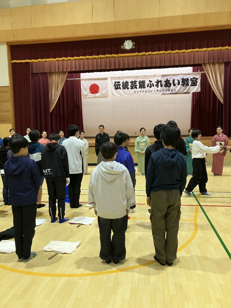 5年生と6年生は、総合的な学習の時間に、伝統芸能の学びをしました。伝統芸能の学びと言っても、鑑賞するだけではありません。先生方に教えてもらって、最後は、舞台で披露してくれました。