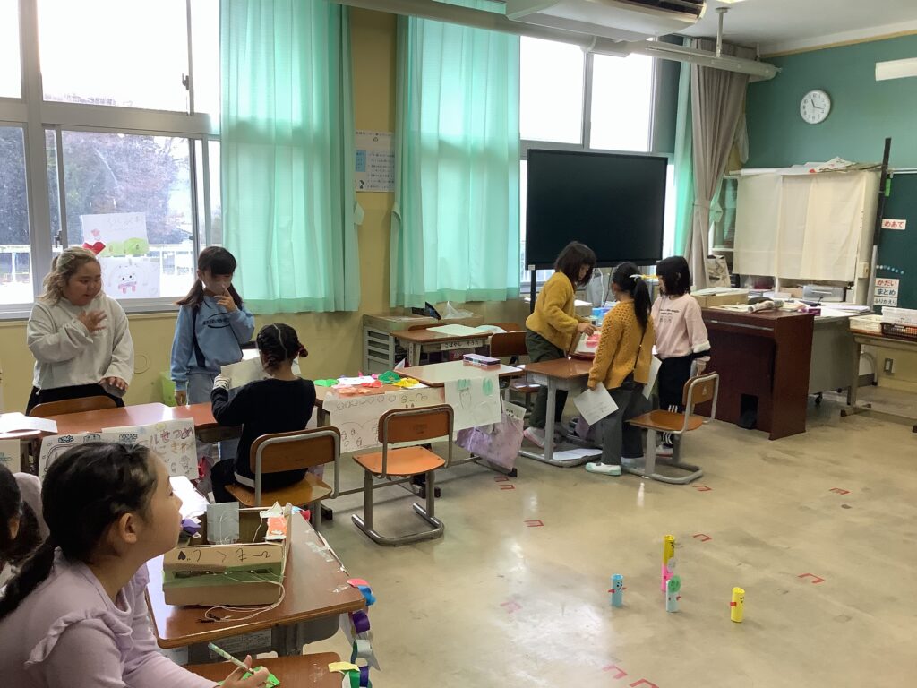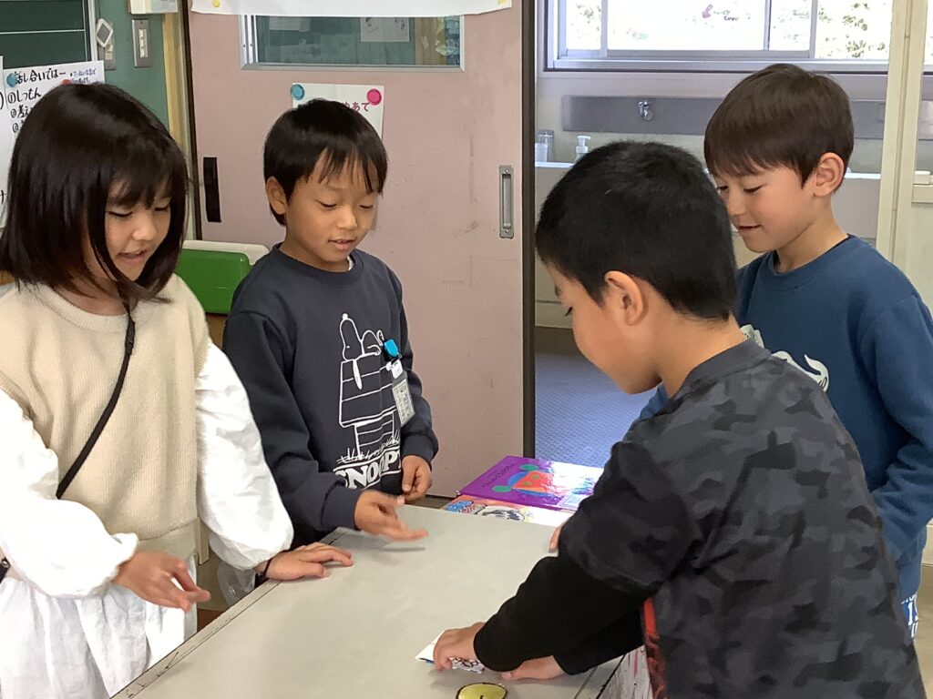 2年生は、生活科で、1年生をおもちゃ大会に招待するという学びをしていました。今日が本番です。今日の本番のために、1年生をおもちゃ屋に招待するために、まず、どういうおもちゃ屋を作るか、おもちゃ遊びのルールをどうするか、景品作りまで、準備をしていました。いろいろなお店がありました。たま入れ、ボーリング、的当て、サッカー、ひもくじ、絵本読みなどなど。自分たちで、どういうことをするか、ペアで考えて、ルールも1年生がわかるように画用紙に書いていました。いよいよ、おもちゃ大会。1年生は、キラキラした目で楽しそうに遊んでいましたね。2年生は、今日の本番で、思い描いたおもてなしができましたか。おもてなしをする人でしたが、自分も楽しむことができましたか。1年生も2年生も楽しむことができたら、大成功です。もしも、他のお店のおもてなしを見て、ああすればよかったということがあれば、それは、立派な学びです。学級で学ぶ意味があります。逆に、他の人が、自分たちのお店のいいところに気づいてくれているかもしれません。学び合いができれば、みんなの成長、クラスの成長につながります。遊んでいるようで学んでいる授業だったのではないでしょうか。