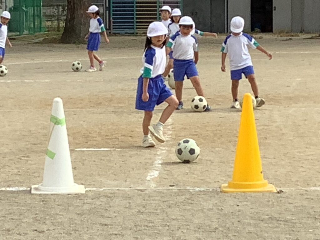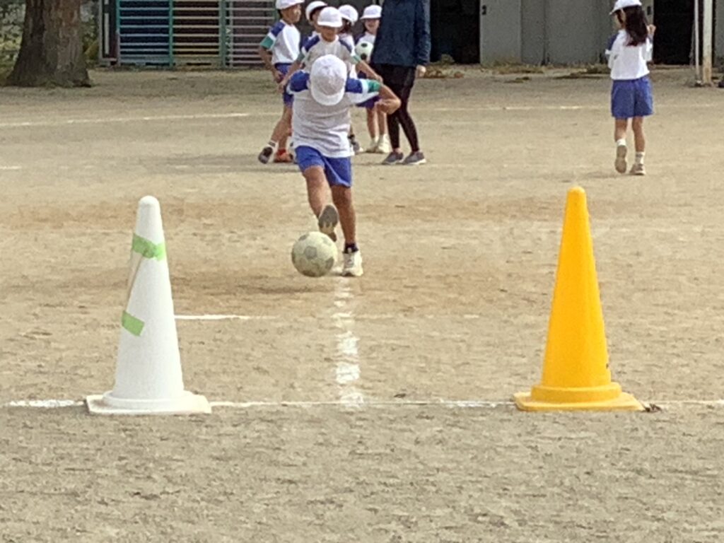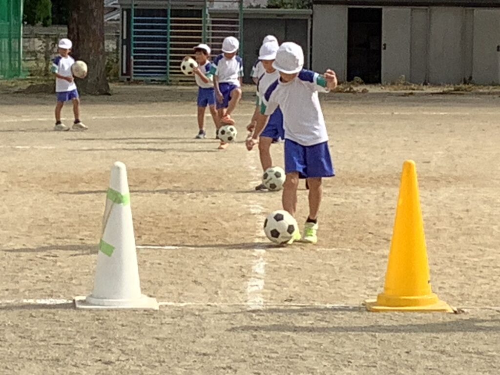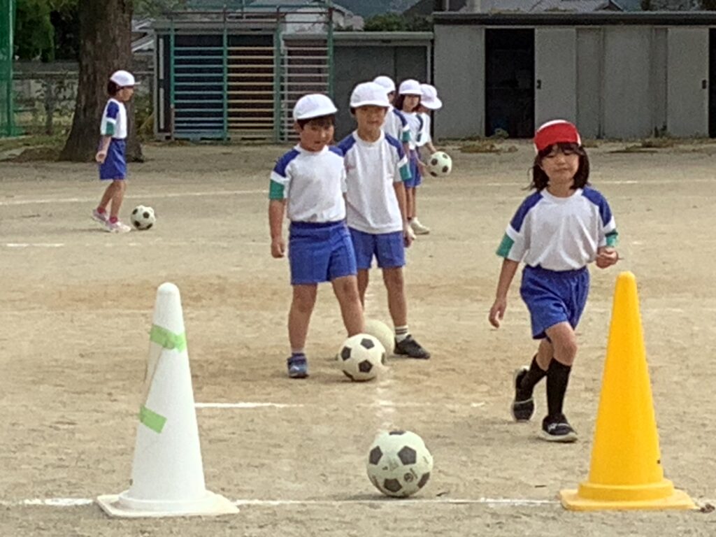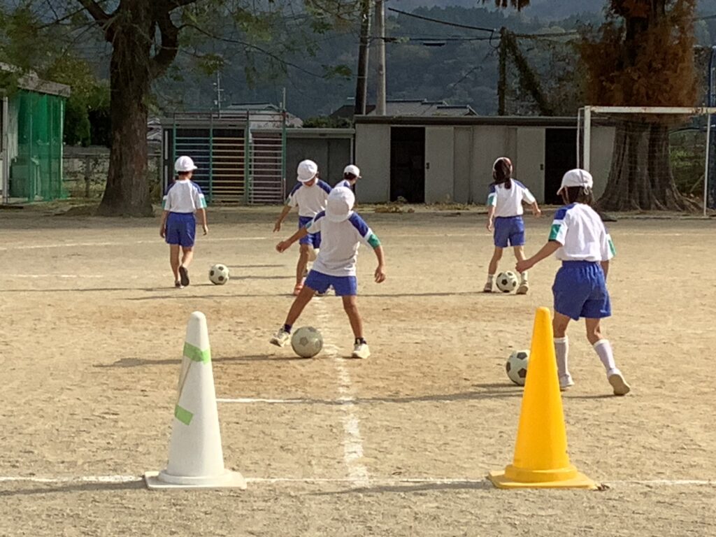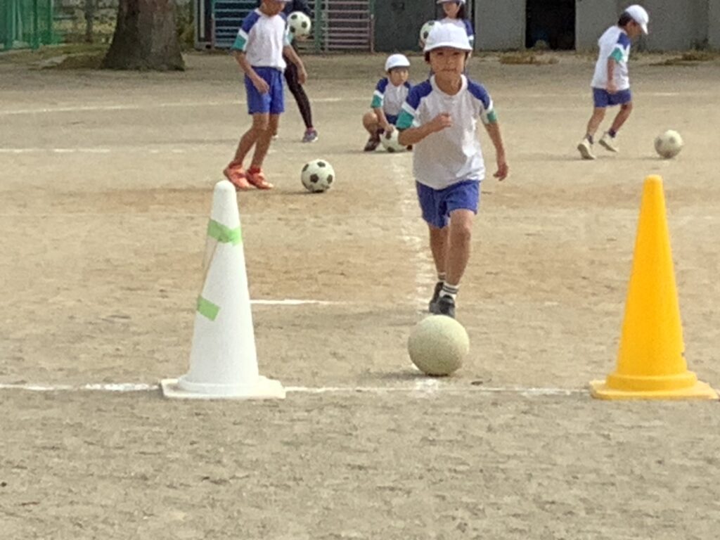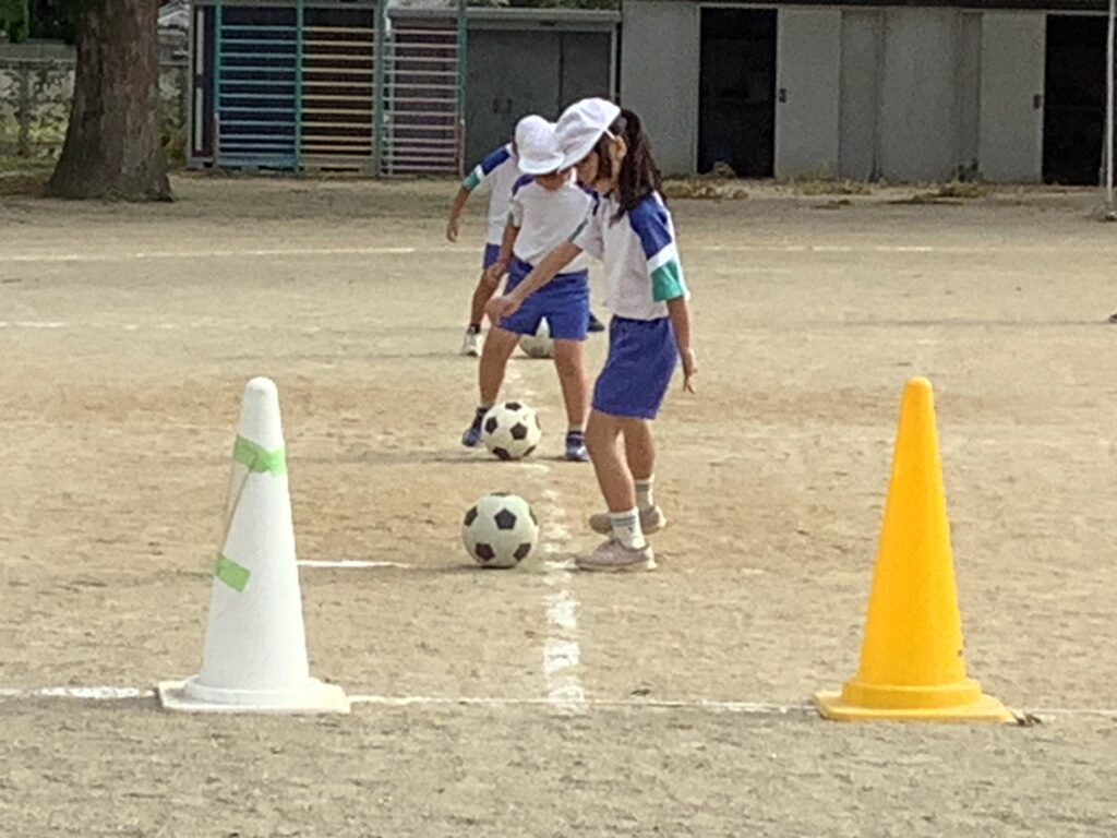2年生は、体育で、持久走とサッカーに取り組んでいました。二つのコーンをゴールに見立てて、ドリブルでゴール前までボールを運んで、最後にゴールをめがけてシュートします。たくさん練習する姿がありました。最後に、上手な人のお手本が披露されたようです。お手本から学ぶことも大切です。見てわからなければ、上手にするコツを聞いてみてもいいかもしれません。