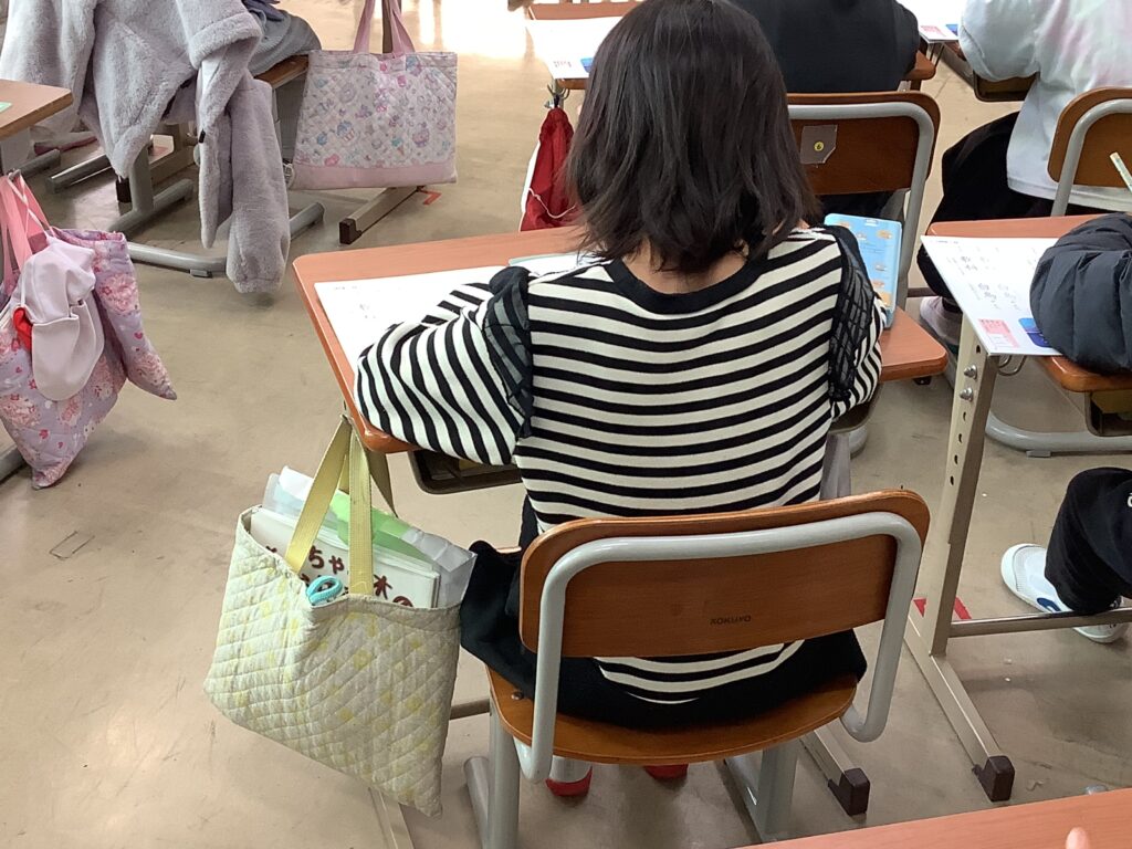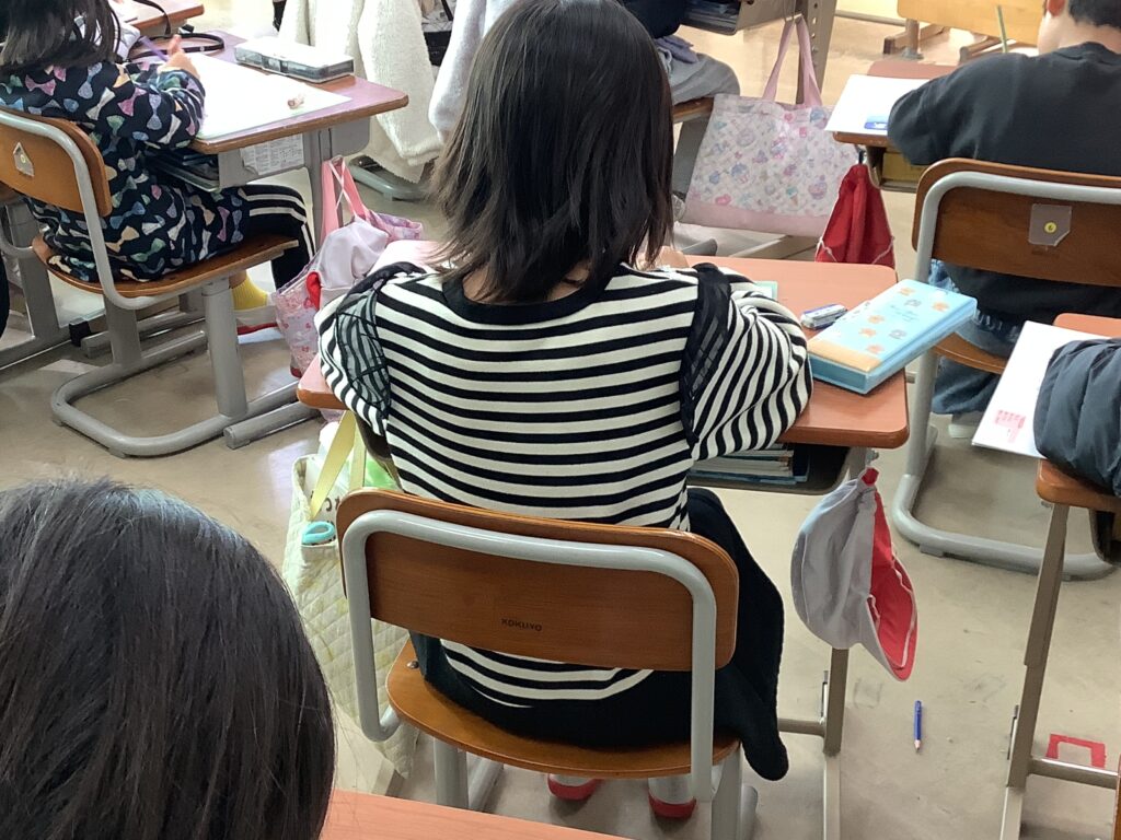 2年生は、国語で、漢字の学びをしていました。今日は、点の書き方に注意します。例えば、学校の学や冬という漢字。点の向きに注意します。あまり意識していませんでしたが、漢字には点が多いですね。この点という字も、四つの点があります。全員が落ち着いて静かに取り組むことができていて、安心して学べる環境と感じました。とてもよいですね。姿勢のいい人を発見しました。背中はいすにつけず、背筋を伸ばして、足はきちんと床につけています。とてもよいお手本です。続けられるとよいですね。顔をノートに近づける人が多いかなと感じました。これを続けると、目が見えにくくなって、近視になってしまいます。姿勢よく書くことを意識できるとよいですね。