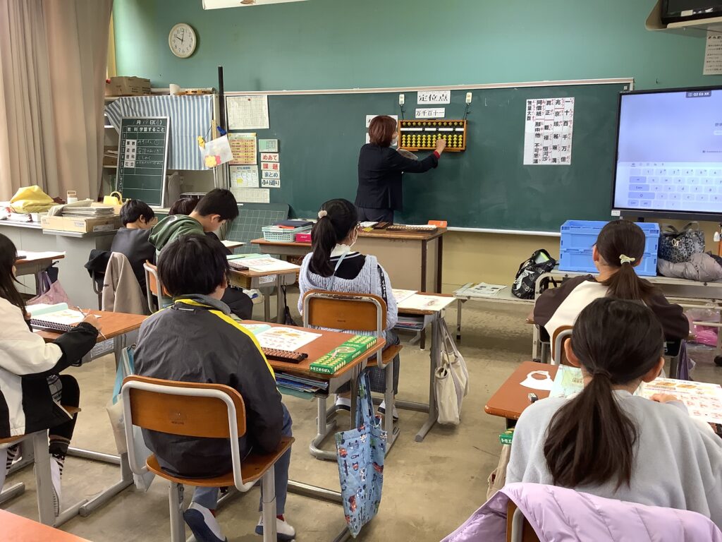 3年生は、算数で、そろばんの学びをしていました。大分そろばん指導協議会からゲストティーチャーに来ていただき、そろばんの使い方を教えていただきました。そろばんで、上手に足し算、引き算ができるでしょうか。