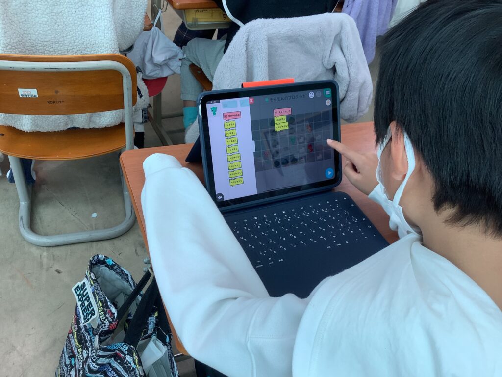 2年生は、タブレットでプログラミングの学びをしていました。コード入力なしに、ブロックをつなげることでプログラミングをしていきます。そらもんが、ケーキを得るのにどういう経路で進めばよいかを考えます。最小の命令でケーキを得ることができば、星3つがもらえます。ぶつかってはいけないものもあり、考えさせられます。いくつ進むかの数も変えることができます。試行錯誤でどんどんプログラミングに慣れてほしいと思います。プログラミングの面白いとことは、命令通りに動くということ。動きがおかしいのは、プログラミングでそういう動きを指示しているから。他の人や環境が悪いのではありませんね。