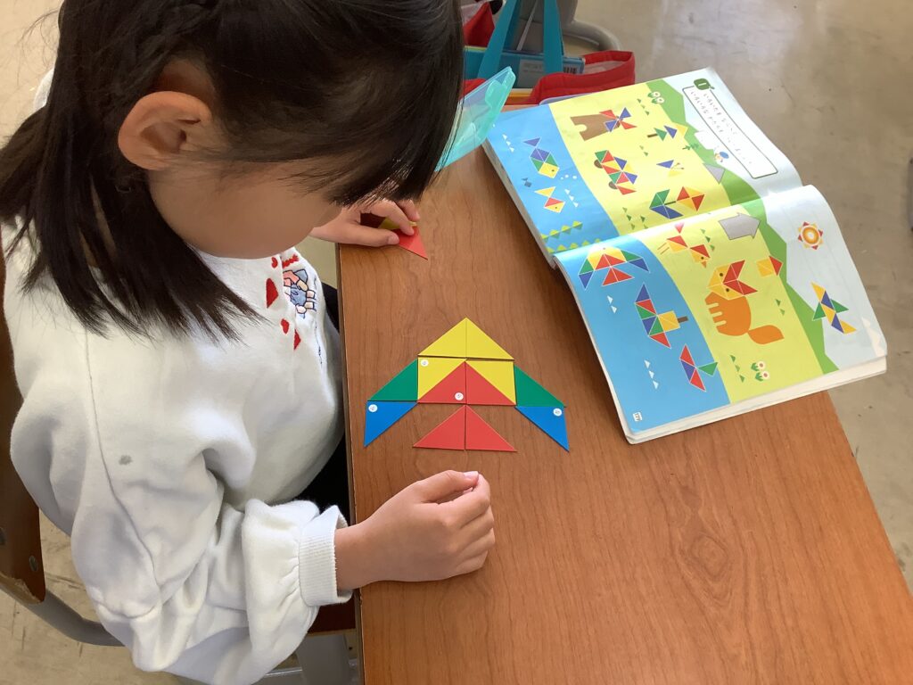 1年生は、算数で、『かたちづくり』に挑戦していました。直角二等辺三角形のマグネットを使って、魚などの形をつくります。カラフルな魚のできあがりです。難しい形のものにもチャレンジしていました。