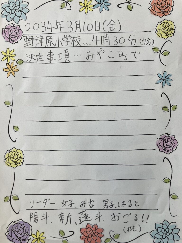 昨日、6年生教室の黒板に、なにやら、「みやこまち」とか「焼肉」、「焼き鳥」、「魚」のような文字が書かれていました。何かと聞いてみると、二十歳になったときの会合の約束のようです。校長先生にもと、案内をいただきました。日程を確認しました。2034年3月10日(金)とあります。今、12歳の6年生が二十歳を迎えるまで8年。そうです。8年後の日付でした。せっかくなので、駆け付けたいと思っています。二十歳になった6年生に会いたいですね。