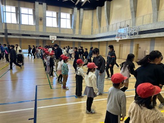 1年生!全体で遊ぶのはこの1回ですが、もうすぐ卒業する6年生と休み時間にたくさん遊んで思い出を作ってくださいね。