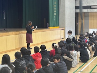 その後、ALTのアリファ先生の日本語によるスピーチ。「私とモチモチの木」