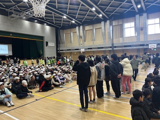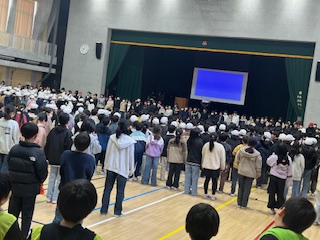 ゲームは、○✖クイズ、ジェスチャーゲーム、じゃんけん列車をしました。ジェスチャーゲームは、前と後ろに分かれて、ジェスチャーする人と答える人を設定しました。じゃんけん列車は、「同じ学年の人でじゃんけんする」「違う学年の人でじゃんけんする」「6年生が入っている列車どうしでじゃんけんする」など、きまりを作って行いました。それぞれのゲームにひと工夫があり、とても楽しかったです。