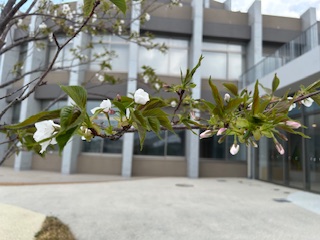 本校の西門近くにあるオオシマザクラは、五分咲きです。