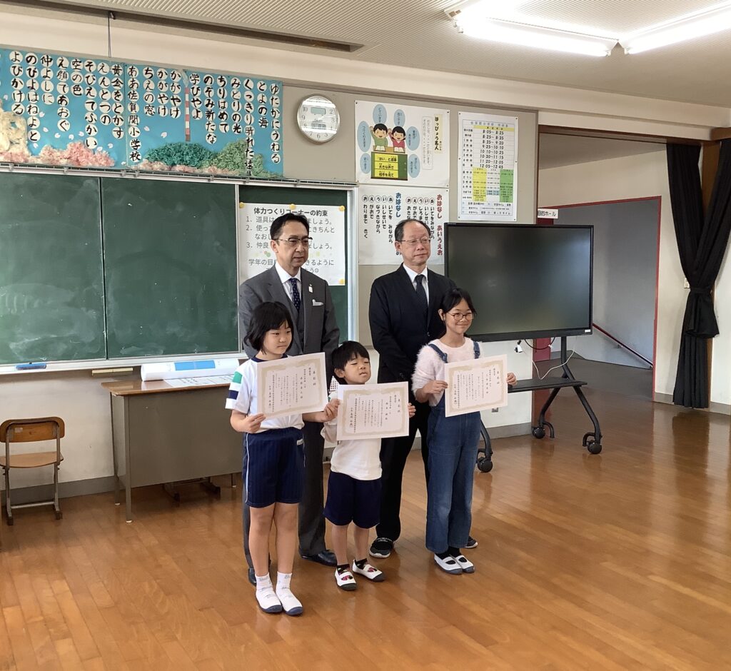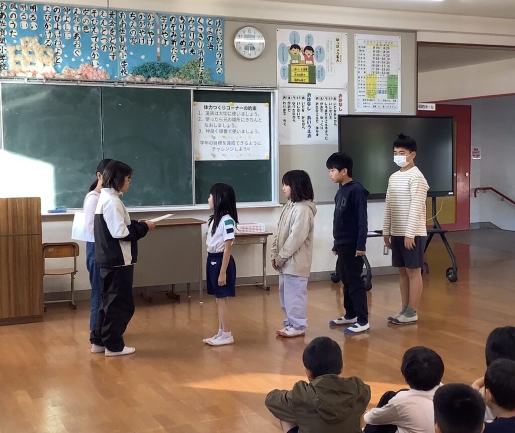 今日は児童集会前に、「親子でつくる」児童標語と差別をなくす人権標語の表彰式を行いました。「親子でつくる」児童標語の表彰式には、青少年健全育成連絡協議会の方に来ていただき、実際に表彰していただきました。その後、児童集会では、生活指導の先生の話や環境委員会から、無言掃除の表彰がありました。みんなの前で自分の頑張りが認められ、とてもうれしそうでした。