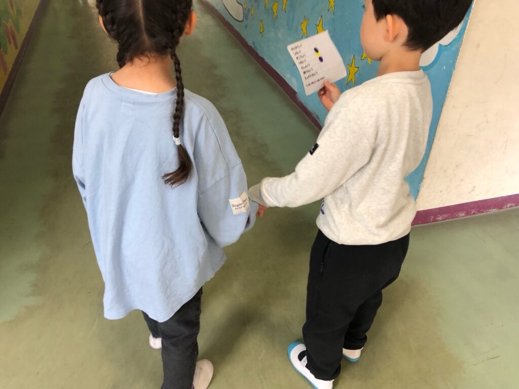 1年生と2年生で校内探検をしました。校内にある教室を見つけたら、シールを貼っていくという活動です。どこに何があるのかを確認しながら、楽しそうにシールを貼っていました。