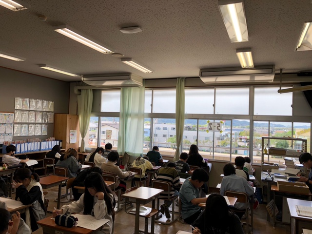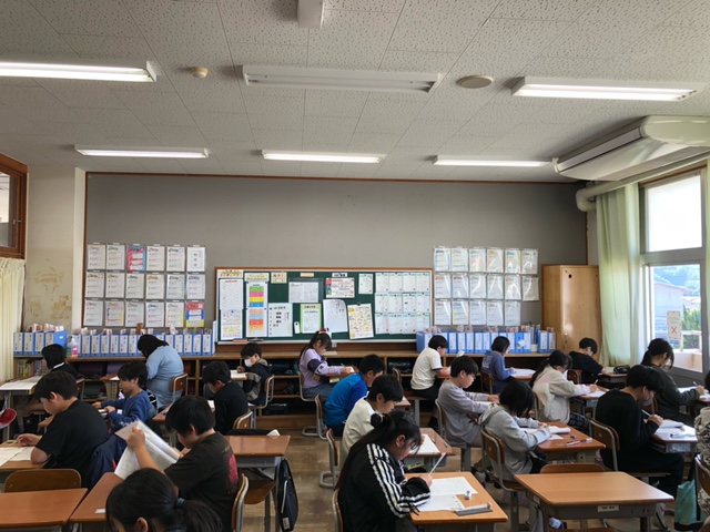 今日は午前中に、5年生が大分県学力定着状況調査を実施しました。本調査は、毎年、県内の小学校5年生と中学校2年生を対象に、児童・生徒の学習指導の充実や学習状況の改善に役立てるために実施しています。1時間目は国語、2時間目は算数、3時間目は理科の問題に、各クラスの児童たちも真剣な表情で取り組んでいました。