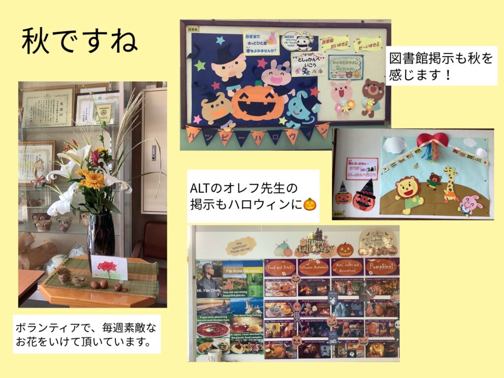 日中はまだまだ暑いですが、朝晩の気温が下がり、少しずつ秋の気配を感じられるようになりました。学校にも、秋の花や、秋の掲示が増えました。いつもありがとうございます。