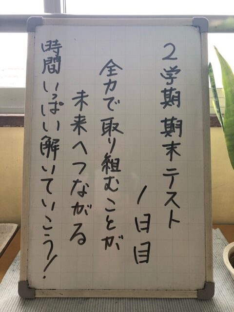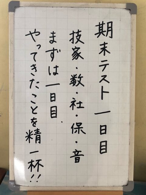 本日、2学期末テスト1日目でした。テストに向けて頑張ってきた成果を、出すことはできたでしょうか。明日もテストはあります。今日も下校はいつもより早いので、下校後の時間の使い方、考えて行動しましょう。ポイントを絞って勉強できるといいですね。最後まで頑張りましょう!体調管理も忘れずに!