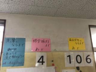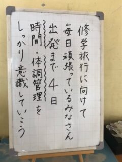 中学校生活最大の行事、修学旅行の日が近づいてきました。今年は11月24日(月)~11月26日(水)の2泊3日の日程で行われます。2年生は、文化発表会が終わってからの1か月、短い期間にも関わらず、順調に準備を進めてきました。体育館での隊形づくりや新幹線ホームでの動きの練習など、とてもスムーズにできています。2年生の集団としての成長を感じます。あとは、当日にしっかりと自主的に活動することができるかです。しおりをよく読み、「日本一誇れる修学旅行」にしましょう。明日は、事前指導、荷物チェックがあります。8:00体育館集合です。体調を万全にして臨んでほしいです。