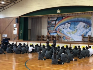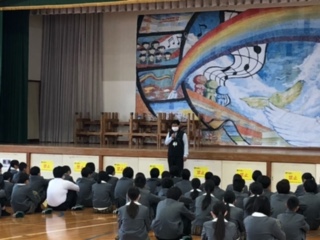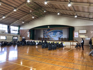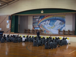 本日、2年生が修学旅行の振り返りの会を行いました。「楽学両道~最高の仲間とともに~」というスローガンのもと、修学旅行では貴重な経験をたくさんして、多くのことを学んだと思います。会の中では、生徒からの振り返りの言葉が述べられましたが、いろいろな事があった中でも、みんなで協力して頑張った様子が伺えました。また、学年主任の先生や校長先生からも、みんな頑張ったことへのお褒めの言葉が多く聞かれました。学年主任の話の中で、「3年生への準備」という言葉がありました。3年生が卒業するまであと3か月、2年生は、3年生になるために、これから何をしていけばいいのか、よく考えてほしいという内容でした。3学期は3年生への0学期と言います。1年後には進路に向けて志望校も決定しています。2年生の次の目標、一人一人がしっかりと持って成長してほしいと期待しています。修学旅行、本当にお疲れさまでした。