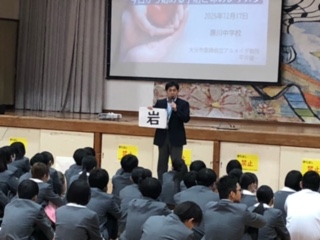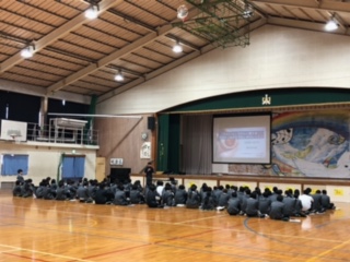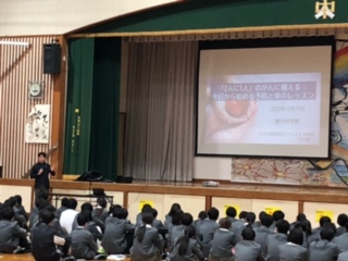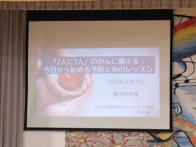 本日、2年生を対象に「がん教育講演会」が行われました。大分市医師会立アルメイダ病院の医師、平井健一先生を講師としてお招きし、「2人に1人」のがんに備える:今日から始める予防と命のレッスンと題してお話をしていただきました。はじめに校長先生から、がんは、江戸時代は「岩」という漢字が用いられていたことの紹介がありました。岩のような固いしこりを意味していたようです。平井先生からは、がん予防には早期発見、早期治療が大事な事、また、生徒のワークシートにもあった、「がんを予防する5つの健康習慣」①禁煙②節酒③食生活改善④身体活動増加⑤適正体重維持が紹介されました。2人に1人はがんになると言われている時代、生徒の皆さんはどのように考えましたか、そして、今日の話をどのように家族に伝えますか。