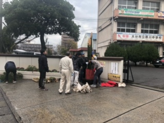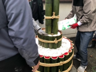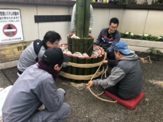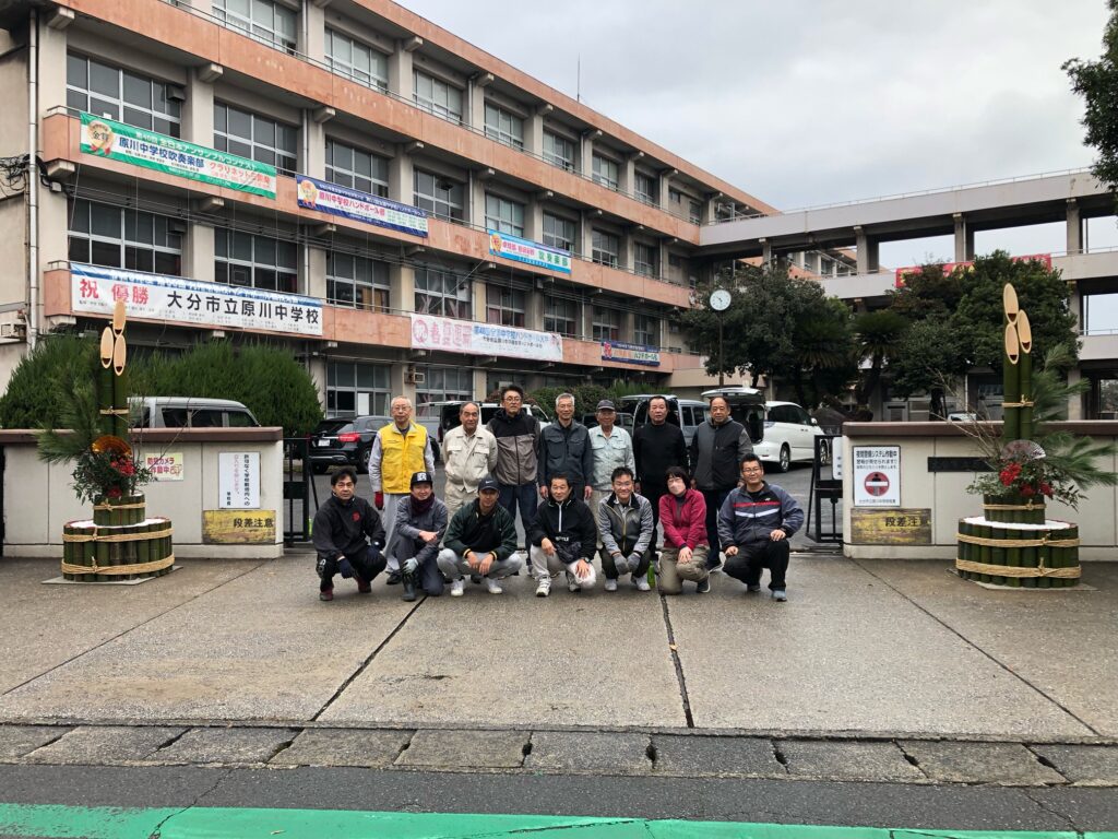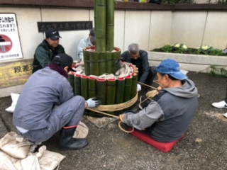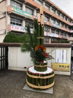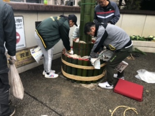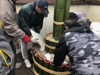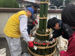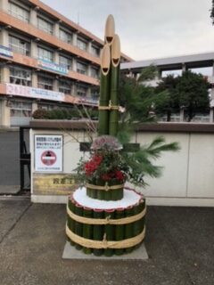 12月21日(日)PTA父親部、父親部OBの方々が原川中学校年末年始の風物詩、門松の制作を行いました。小雨が降り、途中、風も強くなる天気の中でしたが、OBの方々の手際の良さ、作業のスピード、そして何より、作業をする皆さんの元気な姿に、私たち教員も感心するばかりでした。昨年も作業の様子は見ましたが、本当にあの大きな門松を作るには、熟練の技が必要だと改めて感じました。父親部の方々もOBの方々の動きを真剣に見ていたのが印象的でした。毎年、生徒たちも門松を見て、年末だなと感じています。作業に関わっていただいた皆さん、本当にありがとうございました。
