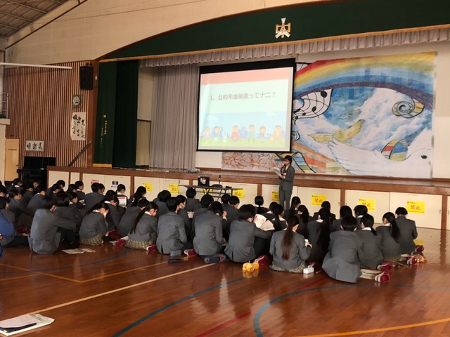 本日、6時間目に3年生が「知っておきたい年金のはなし」と題した、年金についての学習を行いました。日本年金機構大分年金事務所の職員の方が来校し、話をしました。年金というと、中学生にとっては、まだまだ先の話と思っている人がほとんどだと思いますが、20歳になると身近なことになってきます。配布された資料の中で、公的年金は「世代と世代の支え合い」という言葉が出てきます。社会は人と人との支え合いで成り立っています。学校も一緒ですよね。みんなで支え合って生徒会の行事やクラスのことに取り組んでいます。3年生にとっては受験勉強の真っ最中でのお話でしたが、しっかり聞いていました。日本年金機構大分年金事務所の職員の方々、お忙しい中、ありがとうございました。