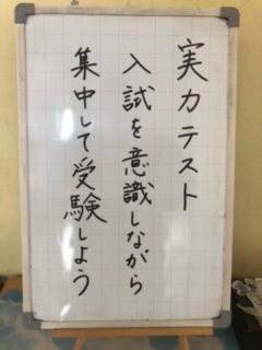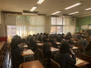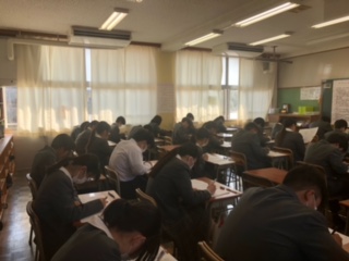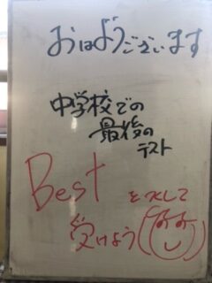 本日、3年生は中学校生活最後の定期テストである卒業テスト、2年生は初めての実力テストが行われました。3年生で、県立入試を受験する生徒にとっては、最後の確認のテストになります。2年生にとっては、初めての1教科60点満点の合計300点満点のテストです。どうだったでしょうか。生徒たちは皆、真剣な表情でテストに臨んでいました。2年生も1年後は受験です。1年間というのは本当にあっという間に過ぎます。3年生の皆さんは実感しているのではないでしょうか。1日1日を大切にしていきたいものですね。2,3年生の皆さん、お疲れさまでした。