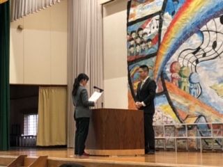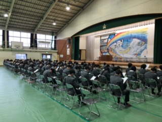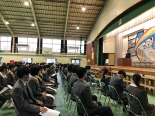 3年生にとって、中学校での生活は最後の週となりました。式の練習も進んでいますが、本日は、同窓会入会説明の会が午後から行われました。会では、原川中出身で同窓会長でもある大分市議会議員の牧貴宏議員が来校し、生徒たちにあいさつをしました。「学んできたことを活かして、人間力を高めていってほしい」、そして「悪口を言うな」、「仲間を大切にしよう」と生徒たちにお話をしていただきました。生きていく中で、とても大切な言葉だと本当に思います。最後に生徒を代表して、堀之内心晴さんが、入会のことばを述べて終わりました。1日1日、卒業へ近づいていきます。「残す3年」として何ができるか。考えて最後まで行動してほしいですね。牧議員、お忙しい中、本当にありがとうございました。